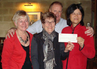 | The Festival's Dame Adrienne Stewart, once again graciously passed cheques to the 2012 Festival's beneficiaries, but this year the function was held on the Festival site. The total proceeds ($56,890.05) considerably exceeded the $40,090.68 which was raised last year, and a total of five charities were supported. The Salvation Army received $20,156.02, The Woolston Brass Band received 15,117.01, The Christchurch Womens Refuge 7,558.51, and The One-2-One Charitable Trust $7,558.51. A special grant of $6,500.00 was made to earthquake survivor, Kate Barron. Carolyn and John wish to thank Dame Adrienne most sincerely for her support, and also to thank everyone who contributed to the Festival. | ||||||